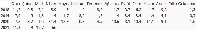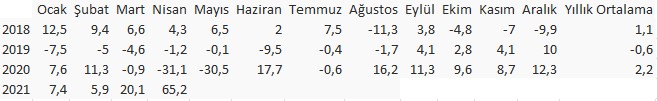 TÜİK verilerine göre, arındırılmamış sanayi üretim endekslerinin yıllık değişim oranları şöyle: