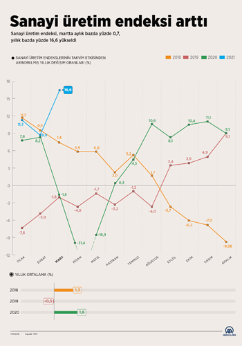 Sanayi üretimi Mart'ta yıllık %16,6 arttı. Foreks anketinde beklenti yüzde 13,4 oranında artış olacağı yönündeydi. Türkiye İstatistik Kurumu (TÜİK) tarafından yapılan açıklamaya göre, sanayinin alt sektörleri (2015=100 referans yıllı) incelendiğinde, 2021 yılı Mart ayında madencilik ve taşocakçılığı sektörü endeksi bir önceki yılın aynı ayına göre %14,8, imalat sanayi sektörü endeksi