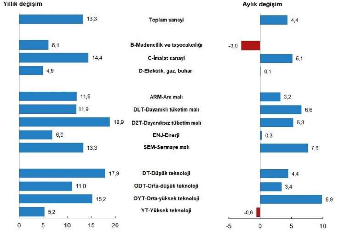 Türkiye İstatistik Kurumu (TÜİK) tarafından yapılan açıklamaya göre, sanayinin alt sektörleri (2015=100 referans yıllı) incelendiğinde, 2022 yılı Şubat ayında madencilik ve taşocakçılığı sektörü endeksi bir önceki yılın aynı ayına göre %6,1, imalat sanayi sektörü endeksi %14,4 ve elektrik, gaz, buhar ve iklimlendirme üretimi ve dağıtımı sektörü endeksi %4,9 arttı.