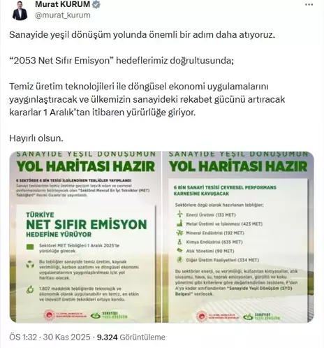 Konuyla ilgili sosyal medya hesabından açıklama yapan Çevre, Şehircilik ve İklim Değişikliği Bakanı Murat Kurum, "Sanayide yeşil dönüşüm yolunda önemli bir adım daha atıyoruz. '2053 Net Sıfır Emisyon' hedeflerimiz doğrultusunda; temiz üretim teknolojileri ile döngüsel ekonomi uygulamalarını yaygınlaştıracak ve ülkemizin sanayideki rekabet gücünü artıracak kararlar 1 Aralık'tan itibaren yürürlüğe giriyor. Hayırlı olsun" ifadelerini kullandı.