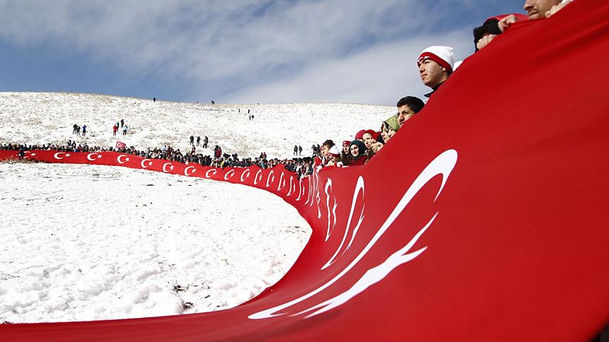 Kent merkezi ile Sarıkamış ilçesinden otobüslerle zirveye ulaşan katılımcılar, Türk bayraklarıyla yürüyerek toplanma alanına geldi. Vatandaşlar, Kızılçubuk bölgesinde şehitler anısına yapılan kardan heykellerin önünde fotoğraf çektirdi.