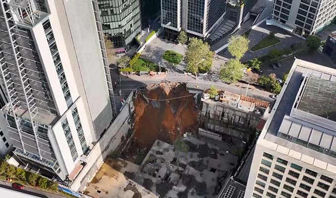 Caddenin iki şeritlik bölümünün ve yanındaki kaldırımın, bir inşaat alanına ait istinat duvarının yıkılması sonucu çöktüğü öğrenildi.