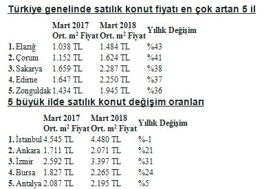 Türkiye genelinde de satılık konut fiyatları artıyor. Türkiye genelinde satılık konut fiyatları son bir yılda yüzde 15 artış gösterdi. Metrekare ortalama fiyatlar 2 bin 83 TL olarak hesaplandı. Amortisman süresi ise 21 yıl oldu. Türkiye genelinde satılık konut fiyatı en çok artan il yüzde 43 artışla Elazığ oldu. Elazığ’ı Çorum, Sakarya, Edirne ve Zonguldak takip etti.