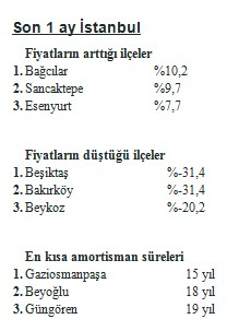 İstanbul’da satılık konut fiyatları son bir yılda yüzde 1 düştü, kiralık konut fiyatları ise yüzde 12 arttı. Satılık konut metrekare ortalama fiyat Mart 2017’de 4 bin 545 TL iken, Mart 2018’de 4 bin 480 TL oldu. Son bir ay içinde fiyatı en çok artan ilçe yüzde 10,2 ile Bağcılar olurken, fiyatı en çok düşen ilçe yüzde -31,4 ile Beşiktaş ve Bakırköy oldu. İstanbul genelinde amortisman süresi de 20 yıl oldu. En kısa amortisman süresine sahip ilçeler arasında ilk sırada 15 yıl ile Gaziosmanpaşa yer aldı.