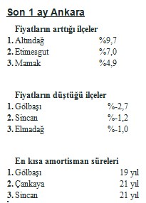 Ankara’da satılık konut fiyatları son bir yılda yüzde 21 artarak 1.711 TL’den 2.071 TL/metrekare ortalamasına ulaştı. Kiralık konut fiyatları ise bir yılda yüzde 8 arttı. Son bir ayda fiyatı en çok artan ilçe yüzde 9,7 ile Altındağ olurken, fiyatı en çok düşen ilçe yüzde -2,7 ile Gölbaşı oldu. Ankara genelinde amortisman süresi de İstanbul’daki gibi 20 yıl oldu. En kısa amortisman süresine sahip ilçeler arasında ilk sırada 19 yıl ile Gölbaşı yer aldı.