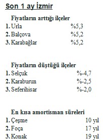 Hürriyet Emlak Mart 2018 Emlak Endeksi verilerine göre, 5 büyük il arasında satılık konut fiyatı en çok artan il İzmir oldu. İzmir’de satılık konut fiyatlarındaki artış son bir yılda yüzde 31 oldu. Son bir ayda fiyatı en çok artan ilçe yüzde 5,3 ile Urla olurken, fiyatı en çok düşen ilçe yüzde -4,7 ile Selçuk oldu. İzmir genelinde amortisman süresi de 22 yıl oldu. En kısa amortisman süresine sahip ilçe 10 yıl ile Çeşme oldu.