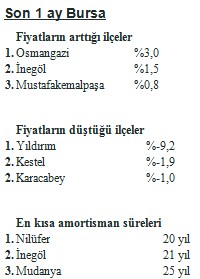 Bursa’da satılık konut fiyatları son bir yılda yüzde 24 arttı. Son bir ayda fiyatı en çok artan ilçe yüzde 3 ile Osmangazi olurken, fiyatı en çok düşen ilçe yüzde -9,2 ile Yıldırım oldu. Bursa genelinde amortisman süresi de 18 yıl oldu. En kısa amortisman süresine sahip ilçeler arasında ilk sırada 20 yıl ile Nilüfer yer aldı.