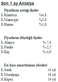 Antalya’da satılık konut fiyatları son bir yılda yüzde 5 arttı. Son bir ayda fiyatı en çok artan ilçe yüzde 4,8 ile Kumluca oldu. Alanya ilçesinde son bir ayda fiyatlar yüzde -7,8 oranında düştü. Antalya genelinde amortisman süresi de 22 yıl oldu. En kısa amortisman süresine sahip ilçeler arasında ilk sırada 14 yıl ile Serik yer aldı.