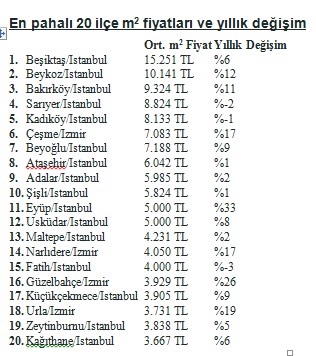 Türkiye genelinde satılık konut fiyatları hız kesmeden yükseliyor. Ağustos 2016’da Türkiye genelinde satılık konut ortalama metrekare fiyatı 2 bin 630 TL iken, Ağustos 2017’de 2 bin 805 TL’ye yükseldi. Hürriyet Emlak Ağustos 2017 Emlak Endeksi verileri, Türkiye’nin en pahalı ilçesinin Beşiktaş olduğunu ortaya koydu. Beşiktaş’ta Ağustos ayı itibarıyla satılık konut ortalama metrekare fiyatı 15 bin 251 TL oldu. Beşiktaş’ı Beykoz ve Bakırköy izledi. Satılık konutta Türkiye’nin en pahalı ilk 20 ilçesi İstanbul ve İzmir’den çıktı. Özellikle lüks konut projeleri, büyük ilçelerdeki fiyatları yukarıya çekti. Konut satın alıp yatırım yapmak isteyenler, İstanbul’daki değerli bölgelere yönelmeye başladı.