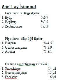 Son bir yıl içinde satılık konut fiyatlarının en çok arttığı ilçe yüzde 33 ile Eyüp olurken, bu sırayı yüzde 25 ile Silivri izledi. Son bir ay içinde ise fiyatı en çok artan ilçe yüzde 6,7 ile Eyüp olurken, fiyatı en çok düşen ilçe yüzde -4,5 ile Bağcılar oldu. İstanbul genelinde amortisman süresi de 18 yıl oldu. En kısa amortisman süresine sahip ilçeler arasında ilk sırada 14 yıl ile Sancaktepe yer alırken, Gaziosmanpaşa 15 yıl, Esenyurt ise 16 yıl ile bu sırayı takip etti.