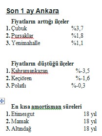 Amortisman süresi 16 yıl olan Ankara’da son bir yılda satılık konut fiyatlarının en fazla arttığı ilçe yüzde 16 ile Etimesgut oldu. Son bir ayda ise fiyatların en fazla arttığı ilçe yüzde 3,7 ile Çubuk oldu. Fiyatların düştüğü ilçeler arasında ilk sırada yüzde -3,5 ile Kahramankazan yer alırken, en kısa amortisman süresine sahip olan ilçeler 18 yıl ile Etimesgut, Mamak ve Altındağ oldu.