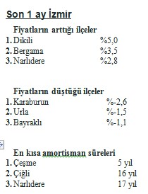 İzmir’deki kiralık konutlarda ise fiyatlar yüzde 5 oranında artarak metrekare bazında 12 TL’ye yükseldi. Amortisman süresinin 18 yıl olduğu İzmir’in popüler sahil ilçesi Aliağa, son bir yılda yüzde 43 artışla rekor kırdı. Son bir ayda ise fiyatların en fazla arttığı ilçe yüzde 5 ile Dikili oldu. Karaburun, yüzde -2,6 ile son bir ayda fiyatların düştüğü ilçeler arasında ilk sıraya yerleşti. En kısa amortisman süresine sahip olan ilçe 5 yıl ile Çeşme oldu.