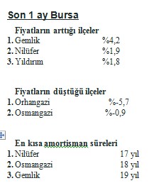 Amortisman süresinin 17 yıl olduğu Bursa’nın son bir yılda satılık konut fiyatlarının en çok arttığı ilçe yüzde 32 ile Yıldırım oldu. Son bir ayda ise fiyatların en çok arttığı ilçe yüzde 4,2 ile Gemlik oldu. Fiyatların düştüğü ilçeler arasında ilk sırada yüzde -5,7 ile Orhangazi yer alırken, en kısa amortisman süresine sahip olan ilçe 17 yıl ile Osmangazi oldu.