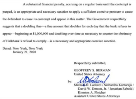Başsavcı Geoffrey Berman imzasıyla mahkemeye yapılan başvuruda, Halkbank’ın katılımı reddetmesi halinde önerilen bir milyon dolarlık cezanın her gün iki katına çıkartılarak katlamalı olarak uygulanmasını talep etti.
