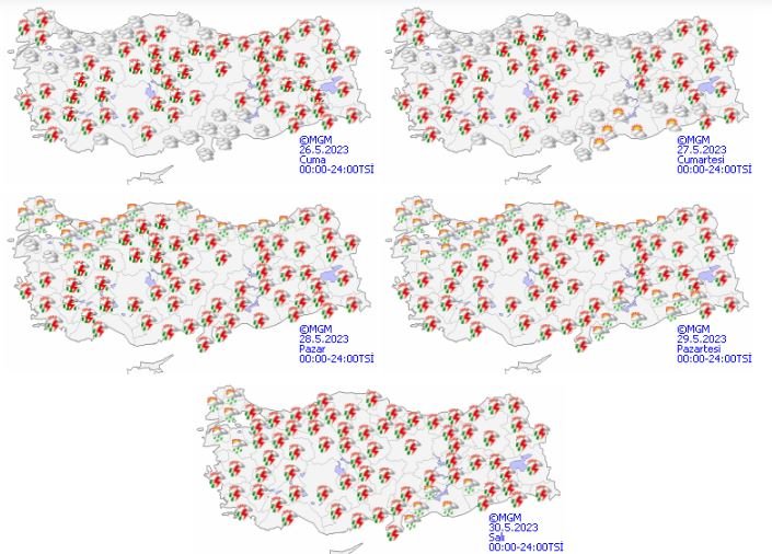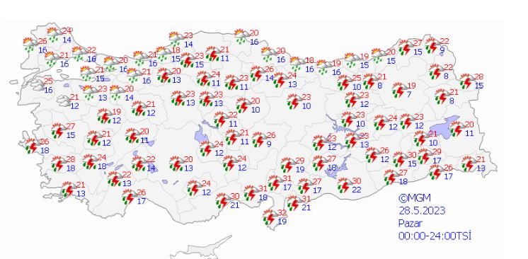 Meteoroloji Genel Müdürlüğü tarafından yapılan son değerlendirmelere göre: Ülkemiz genelinin parçalı ve çok bulutlu, Trakya, Ege, Göller Yöresi, İç Anadolu, Batı ve Orta Karadeniz'in iç kesimleri, Doğu Karadeniz, Doğu Anadolu, Güneydoğu Anadolu'nun doğusu ile Bilecik ve Ordu çevrelerinin aralıklı sağanak ve gök gürültülü sağanak yağışlı geçeceği tahmin ediliyor.