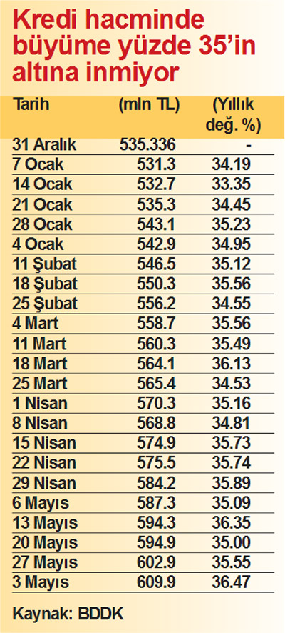 BDDK’nın haftalık verilerine göre, 3 Haziran itibariyle kredilerde bir önceki haftaya göre artış oranı ise yüzde 1.16 oldu. Krediler 2010 sonunda ise 535.3 milyar lira seviyesindeydi.