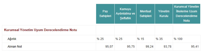 "Türkiye'de Sermaye Piyasası Kurulu (SPK) Kurumsal Yönetim İlkeleri'ne uygun olarak derecelendirme yapmak üzere faaliyet izni bulunan derecelendirme kuruluşu SAHA Kurumsal Yönetim ve Kredi Derecelendirme Hizmetleri A.Ş. tarafından "Kurumsal Yönetim Derecelendirme Dönemsel Revizyon Raporu" tamamlanmıştır. 2023 yılında 9,53 (%95,35) olan Kurumsal Yönetim Derecelendirme notumuz 2024 yılı için yapılan değerlendirmede 9,54 (%95,41) olarak yukarı yönlü revize edilmiştir.