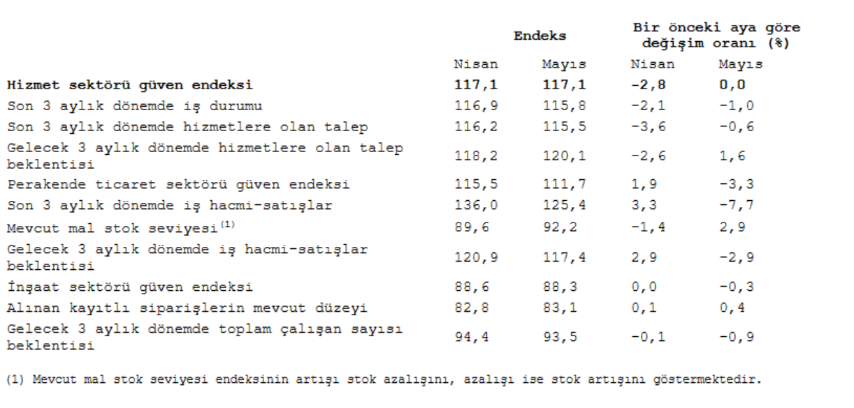 Türkiye İstatistik Kurumu (TÜİK) tarafından yapılan açıklamaya göre, mevsim etkilerinden arındırılmış güven endeksi mayıs ayında bir önceki aya göre; hizmet sektöründe aynı düzeyde kalarak 117,1 değerini, perakende ticaret sektöründe %3,3 oranında azalarak 111,7 değerini ve inşaat sektöründe %0,3 oranında azalarak 88,3 değerini aldı.