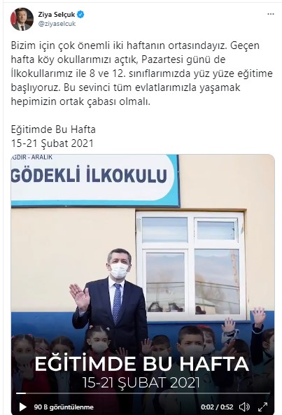 Milli Eğitim Bakanı Ziya Selçuk, yüz yüze eğitim sürecine ilişkin Twitter'dan yaptığı değerlendirmede Selçuk, "Bizim için çok önemli iki haftanın ortasındayız. Geçen hafta köy okullarımızı açtık, Pazartesi günü de İlkokullarımız ile 8 ve 12. sınıflarımızda yüz yüze eğitime başlıyoruz. Bu sevinci tüm evlatlarımızla yaşamak hepimizin ortak çabası olmalı" ifadelerini kullandı.