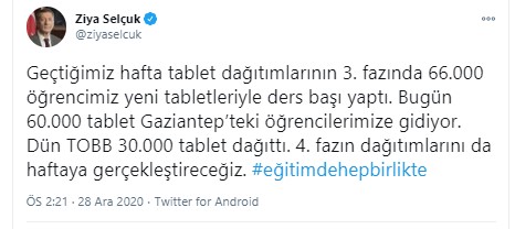 Bakan Ziya Selçuk, Twitter hesabından yaptığı açıklamada, "Geçtiğimiz hafta tablet dağıtımlarının 3'üncü fazında 66 bin öğrencimiz yeni tabletleriyle ders başı yaptı. Bugün 60 bin tablet Gaziantep’teki öğrencilerimize gidiyor. Dün Türkiye Odalar ve Borsalar Birliği 30 bin tablet dağıttı. 4'üncü fazın dağıtımlarını da haftaya gerçekleştireceğiz" ifadelerini kullandı.