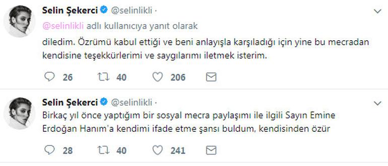 Şekerci, paylaşımında "Birkaç yıl önce yaptığım bir sosyal mecra paylaşımı ile ilgili Sayın Emine Erdoğan Hanım'a kendimi ifade etme şansı buldum, kendisinden özür diledim. Özrümü kabul ettiği ve beni anlayışla karşıladığı için yine bu mecradan kendisine teşekkürlerimi ve saygılarımı iletmek isterim" ifadelerini kullandı.