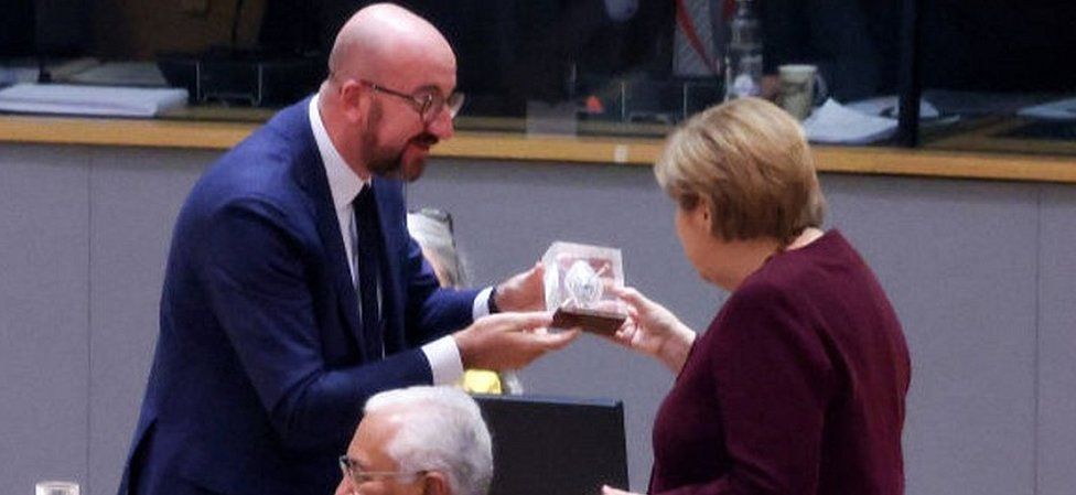Merkel'e veda hediyesi olarak, 2017 yılından beri AB liderlerinin düzenlendiği AB Konseyi binasının küçük bir heykeli verildi.