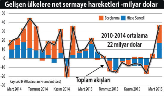 IIF, gelişmekte olan ülkelerden geçen yıl 750 milyar dolar olan net sermaye çıkışının bu yıl yavaşlayarak 500 milyar dolar civarında gerçekleşmesini beklediğini ifade etti. Böylece daha önce 735 milyar dolar olarak hesapladığı 2015 sermaye çıkışlarını 15 milyar dolar daha artırdı.
