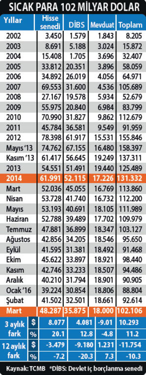Yabancıların nette 2 milyar dolara varan sermaye girişi yanında fiyat değişimlerinin yarattığı etkiyle sıcak para stoku martta 10 milyar dolar arttı. Yabancıların Türkiye portföyü şubat sonunda 92.6 milyar dolardan mart sonunda 102.1 milyar dolara yükseldi ve bir ayda yüzde 11.2 artış kaydetti.