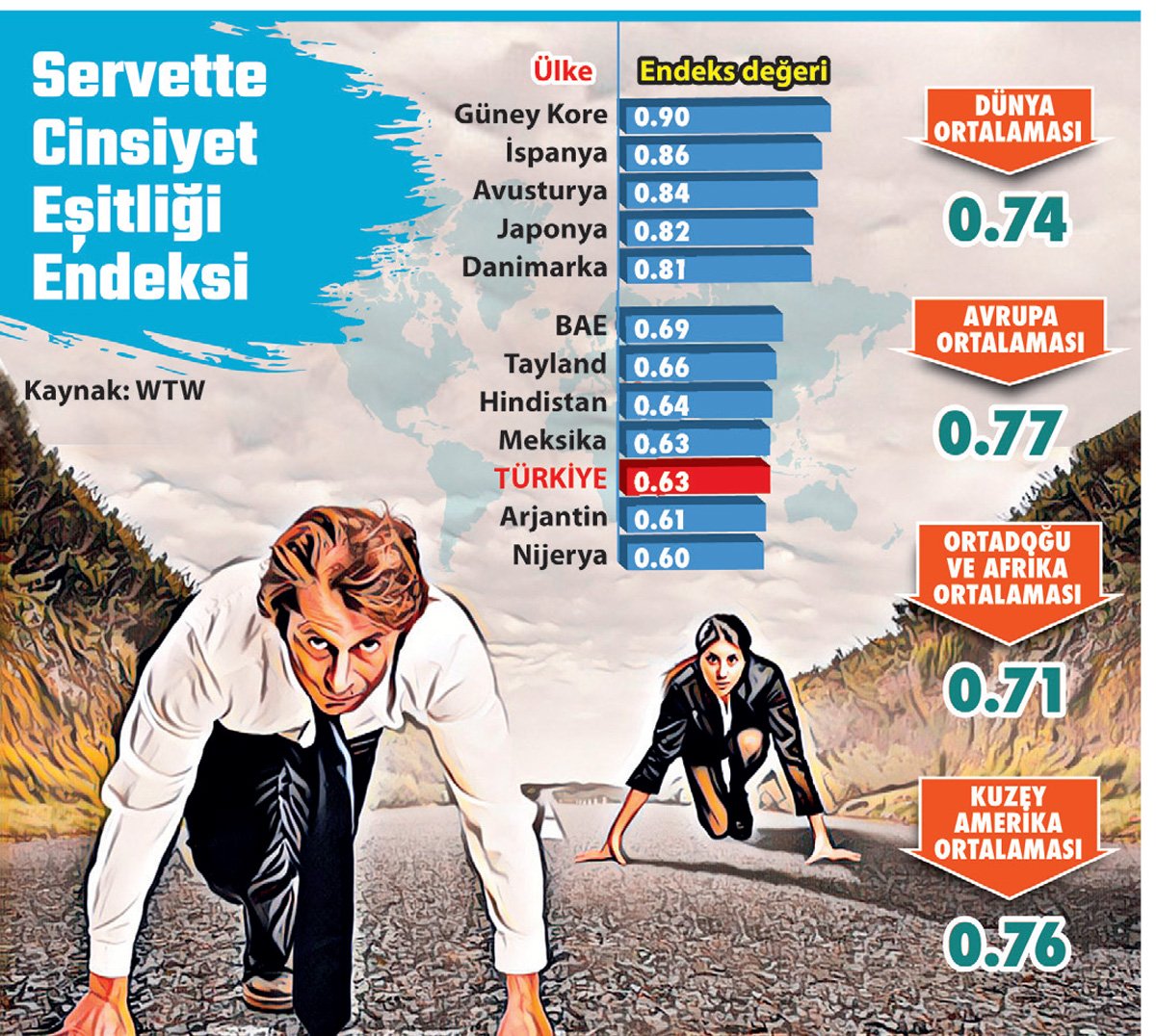 Global danışmanlık şirketi WTW'nin Dünya Ekonomik Forumu ile birlikte hazırladığı endeks, 39 ülkeyi kapsıyor. Her ülkenin endeks değeri özetle kadınların hayatları boyunca biriktirdikleri servetin erkeklerin biriktirdiği servete bölünmesi ile ortaya çıkıyor. 1'e yaklaşan değerler eşitliğin arttığını, 0'a yaklaşan değerler ise eşitsizliğin derinleştiğini ortaya koyuyor.