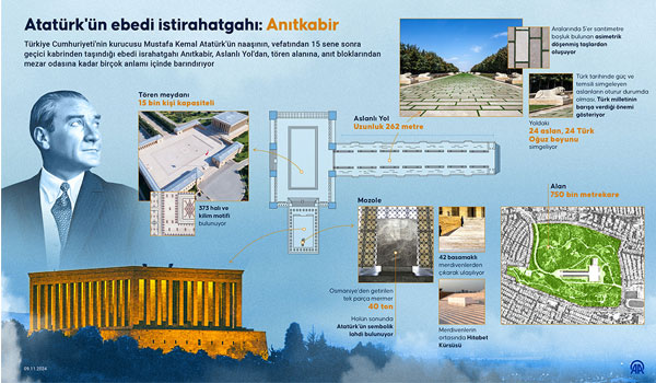 "Benim naçiz vücudum elbet bir gün toprak olacaktır, fakat Türkiye Cumhuriyeti ilelebet payidar kalacaktır" diyen Atatürk, ebedi istirahatgahı olan Türkiye'nin kalbi Anıtkabir'de Türk milletinin gönlünde yaşamaya devam ediyor.