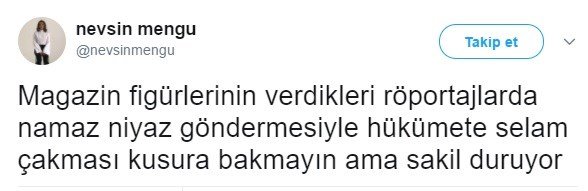 Mengü sosyal medya hesabından isim vermeden ‘magazin figürleri’ne ‘namaz’ göndermesinde bulundu. Acun Ilıcalı’nın sevgilisi Şeyma Subaşı da Hürriyet’e verdiği röportajda ‘Evet. Gece yatakta çok ağladım. Namaz kılarken çok ağladım. Şu an tabii bu sosyallikte kılamıyorum. Allah affetsin diyelim, içimizi biliyor…’ ifadelerini kullanmıştı.