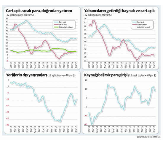 Bu noktada son yıllardaki politik dalgalanmalar karşısında sıcak para ve genel olarak yabancı yatırımların nasıl hareket ettiğine bakmakta yarar var. Sayfadaki grafiklerde 2013 ve sonrasındaki süreçte cari açık ile sıcak para, doğrudan yatırımlar, kaynağı belirsiz para girişi ve yerlilerin yurt dışına çıkardığı para miktarının 12 aylık toplamlara göre seyrini görüyorsunuz.