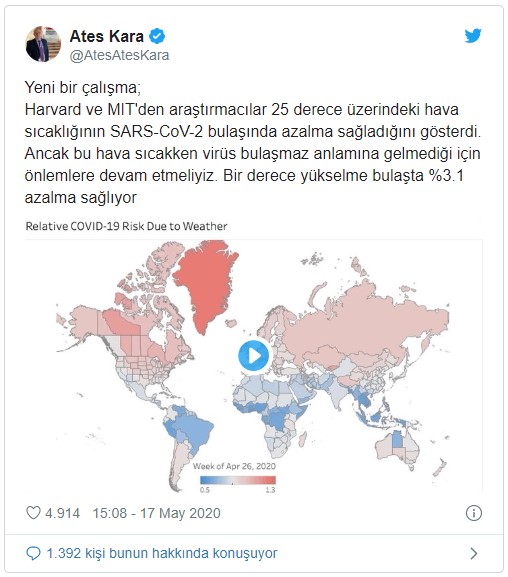 Kara paylaşımında şunları yazdı: "Harvard ve MIT’den araştırmacılar 25 derece üzerindeki hava sıcaklığının SARS-CoV-2 bulaşında azalma sağladığını gösterdi. Ancak bu hava sıcakken virüs bulaşmaz anlamına gelmediği için önlemlere devam etmeliyiz. Bir derece yükselme bulaşta %3.1 azalma sağlıyor."