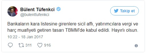 Kredi, kredi kartı, çek ve senet gibi borçları olanların ve "kara liste"de bulunan borçluların merakla beklediği sicil affı için müjdeyi ocak ayında Gümrük ve Ticaret Bakanı Bülent Tüfenkci müjdeyi vermişti. Konuyla ilgili Twitter'dan açıklama yapan Gümrük ve Ticaret Bakanı Bülent Tüfenkci, sicil affı kanununun TBMM'de kabul edildiğini bildirmişti.