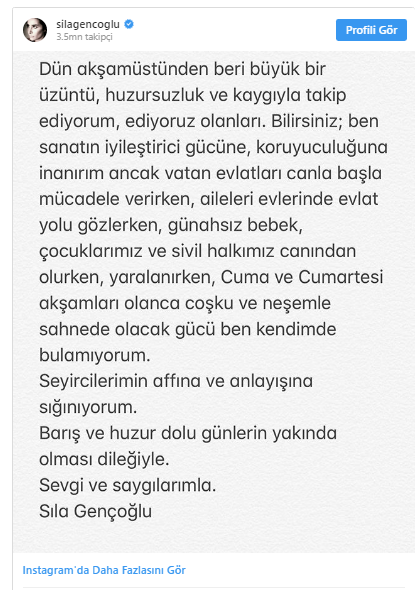 "Dün akşamüstünden beri büyük bir üzüntü, huzursuzluk ve kaygıyla takip ediyorum, ediyoruz olanları. Vatan evlatları canla başla mücadele verirken, aileleri evlerinde evlat yolu gözlerken, günahsız bebek, çocuklarımız ve sivil halkımız canından olurken, yaralanırken, cuma ve cumartesi akşamları olanca coşku ve neşemle sahnede olacak gücü kendimde bulamıyorum."