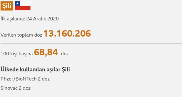 BBC Türkçe'deki habere göre; Ülkenin başkenti Santiago'da yaşayan ve gözlemlerini paylaşan gazeteci Jane Chambers'ın aktardığına göre Şili, kıtada çeşitli kısıtlama önlemleri dışında aşı programına en hızlı girişen ülke oldu.
