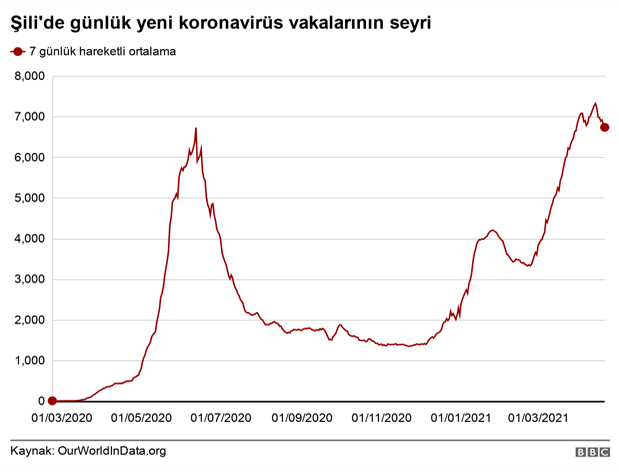 Şili'de, 2020 Mart'ından itibaren artan vakalar Haziran ayının ortasında günlük 7000'lere yükselerek birinci zirveye yol açtı.