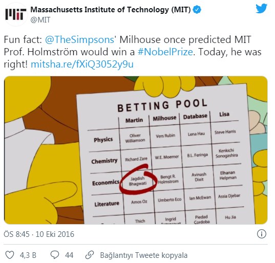 2010'da yayımlanan bir bölümde göz açıp kapayıncaya kadar geçen bir sahnede Milhouse, Finli ekonomist Bengt R. Holmstrom'un Nobel Ekonomi Ödülü'nü kazanacağına dair bahse girmişti. Nitekim Holmstrom 6 yıl sonra (Oliver Hart'la birlikte) bu ödülü gerçekten de kazanmıştı.