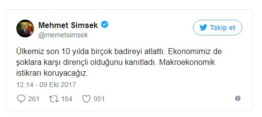 Başbakan Yardımcısı Mehmet Şimşek, "Ülkemiz son 10 yılda birçok badireyi atlattı. Ekonomimiz de şoklara karşı dirençli olduğunu kanıtladı. Makroekonomik istikrarı koruyacağız." ifadesini kullandı.