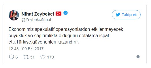 Ekonomi Bakanı Nihat Zeybekci de şu mesajı paylaştı: "Ekonomimiz spekülatif operasyonlardan etkilenmeyecek büyüklük ve sağlamlıkta olduğunu defalarca ispat etti. Türkiye, güvenenleri kazandırır."