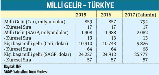 Aynı IMF verilerine göre; Türkiye’nin cari milli geliri 2016 için toplam 857 milyar dolar hesaplanırken, küresel sıralamada 17. ülke olarak kalmışız. Cari olarak bakıldığında, kişi başı milli gelir ise 2016 için 10 bin 742 dolar olarak hesaplanırken, küresel sıralamadaki yerimiz tam olarak 64. basamakta bulunuyor. Satın alma gücü paritesine göre ise toplamda 1 trilyon 988 milyar dolarla 13. sırada; 24 bin 912 dolarla 57. sırada. Cari ve SAGP iki ayrı kategori.