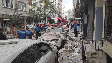 Patlamanın etkisiyle binadan kopan molozlar orada bulunan araçların üstüne düşerken, çevredeki bazı binaların camları da kırıldı.
