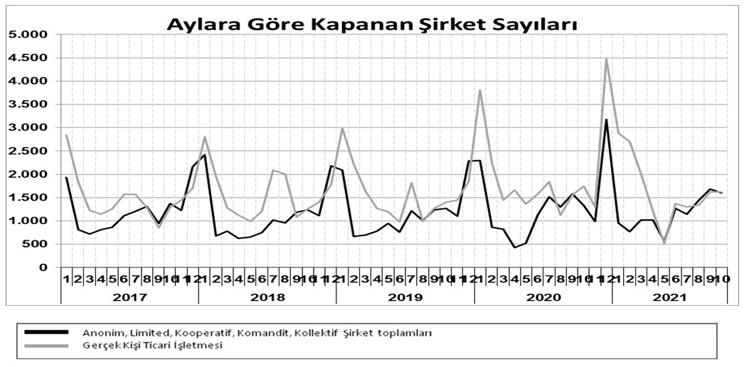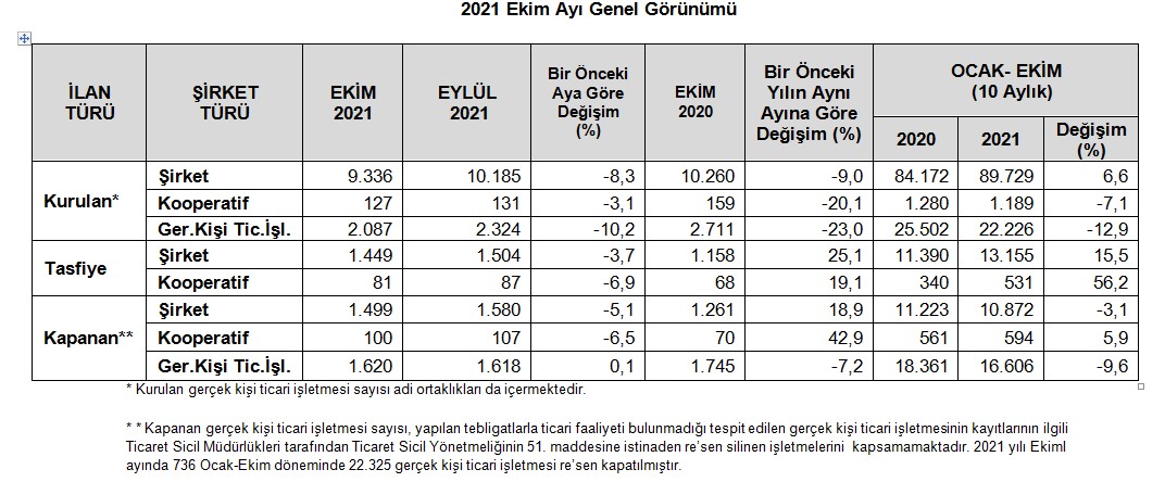 Ekim 2021’de, kapanan şirket sayısı 2020 yılının aynı ayına göre %18,9 kapanan kooperatif sayısında %42,9 oranında artış olup kapanan gerçek kişi ticari işletme sayısında %7,2 oranında azalış olmuştur.
