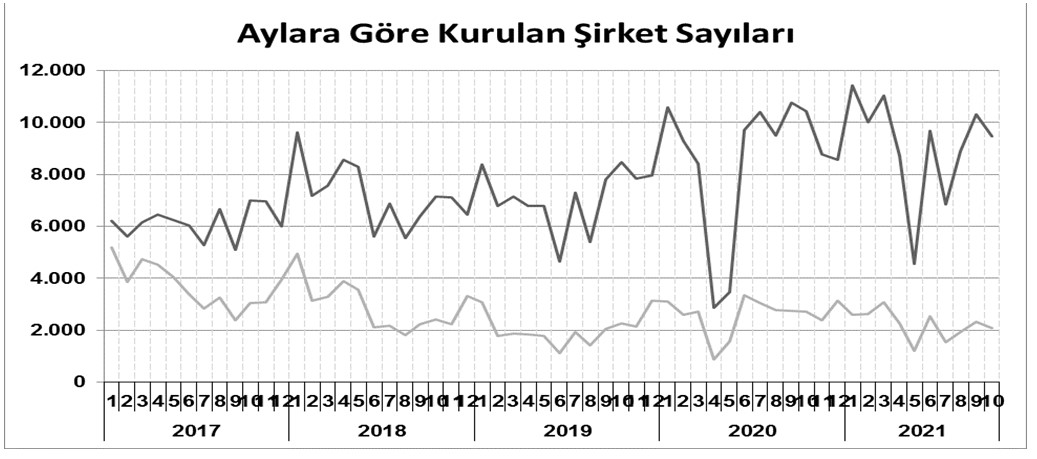 2021 yılında toplam 90.918 şirket ve kooperatif kurulmuştur. Bu dönemde kurulan toplam 77.973 limited şirket, toplam sermayenin %55,2’sini, 11.739 anonim şirket ise %44,8’ini oluşturmaktadır. Ekim ayında kurulan şirketlerin sermayelerinin toplamı, Eylül ayına göre %13,8 oranında artmıştır.