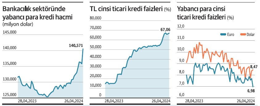 Bankacılık Düzenleme ve Denetleme Kurumu (BDDK) verilerine göre TL cinsi ticari kredi hacmi 5.53 trilyon lira seviyesinde. Geçen yıl nisan sonunda bu rakam 4.39 trilyon liraydı. Kredi hacmindeki büyüme yüzde 26 seviyesinde. Yabancı para kredilerin dolar cinsi karşılığı ise geçen yılın aynı dönemine göre 26 Nisan haftasında yüzde 6,85 artışla 140 milyar 571 milyon dolara yükseldi. 12 Ağustos 2022'den bu yana yabancı para kredilerin büyüklüğü 140 milyar doları aşamamıştı. Ekonomistlerin hesaplamalarına göre yabancı para kredilerde 13 haftalık yıllıklandırılmış artış TL kredileri geçti. TL kredilerde 13 haftalık yıllıklandırılmış büyüme yüzde 35,8 olurken, yabancı para kredilerde 13 haftalık yıllıklandırılmış artış yüzde 38,9'a ulaştı.