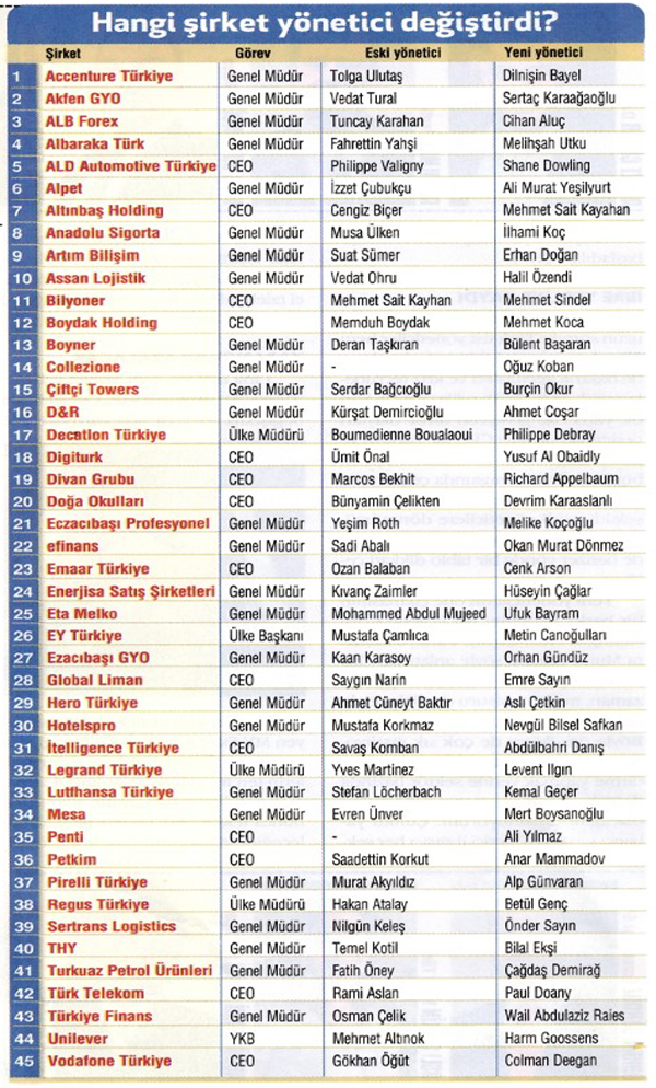 Türkiye ekonomisi zor bir dönemden geçiyor. Tüketici talebinde azalma, yükselen kurlar, alacakların zamanında tahsil edilememesi gibi nedenler şirketlerin performansını olumsuz etkiliyor. Şirketler bu gidişe dur diyecek, bu zor zamanlarda geminin rotadan çıkmasına engel olacak bir kaptana ihtiyaç duydukları için yeni yönetici arayışına girdi. Bu da pek çok şirkette CEO, genel müdür ve ülke müdürü değişimlerini beraberinde getirdi. Son iki ayda Unilever'den Türk Telekom'a, D&R'dan Altınbaş Holding'e kadar 45 şirket yönetici değiştirdi.
