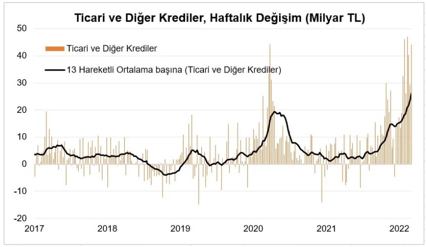 2022'nin ilk üç ayında toplam TL kredi hacmi 380 milyar TL artarken, bu artışın yüzde 90'ı ticari krediler kaynaklı oldu.