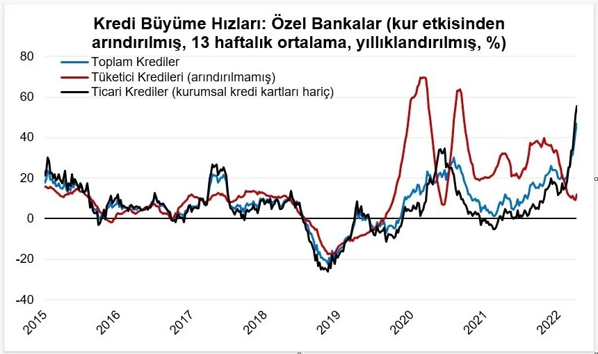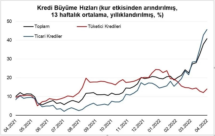 Böylece 2022'nin ilk çeyreğinde TL ticari kredi hacminde artış, geçen senenin aynı dönemine göre yaklaşık 10'a katlandı.