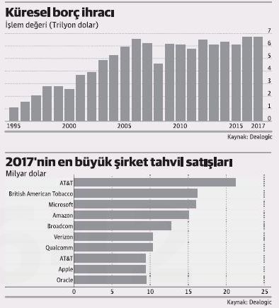 Dealogic tarafından hazırlanan tablolarda Fannie Mae ve Freddie Mac gibi devlet kurumlarının tahvil satışlarını da içeren bu yılın taksiminin 2016 rekorunu aştığı görülüyor. Tarihi 6.8 trilyon dolarlık rakam mortgage ve varlık destekli menkul kıymetlerin yanı sıra ipotekli bonoları içeriyor. Ancak açık artırmayla satılan ABD Hazine ve Birleşik Krallık 10 yıllıkları gibi devlet tahvilleri ve belediye menkul kıymetlerini ise kapsam dışında kalıyor. JPMorgan ve Citi'nin başını çektiği bankaların kasalarına 2017'de tahvil ücretlerinden 30 milyar dolar girdi. Bu rakam kayıtların tutulmaya başladığı 2000 yılından beri en yüksek seviyeye. Bank of America Merrill Lyncy sermaye piyasaları müdürü AJ Murphy, "Borç ihraçları haritanın her yerinde alışılmışın dışındaydı. Latin Amerika iyi bir yıl geçirirken Asya mükemmel bir yıl yaşadı. Yine de, diğer bölgelerden ABD ve Avrupa piyasalarına paranın aktığını görüyoruz" diye konuşuyor. ABD'li yatırım bankası Goldman Sachs'ın küresel satın alma finansman sorumlusu Christina Minnis, "Birleşme ve satın alma birimlerinin hacmi nispeten sağlam olacağına inanıyoruz, daha fazla borç ihracı olacak. Finansal sponsorlar muazzam bir biçimde sermayelerini yükseltti ve kendilerinden emin oldukları ölçüde aktif kalacaklar" diye öngörüde bulunuyor.