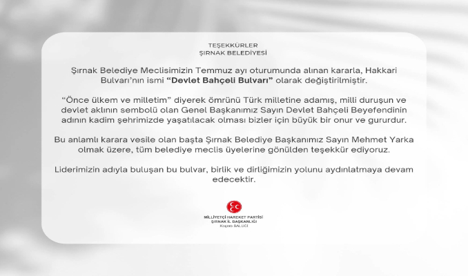 MHP Şırnak İl Başkanlığı'nın sosyal medya hesabından yapılan paylaşımda, Şırnak Belediyesi meclisinin Temmuz ayı oturumunda alınan kararla Hakkari Bulvarı'nın isminin "Devlet Bahçeli Bulvarı" olarak değiştirildiği belirtildi.